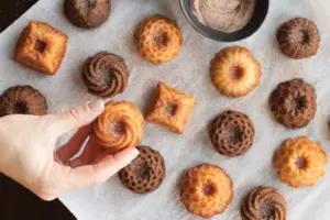 For another prepping technique, apply a thin coating of solid vegetable shortening (such as “Crisco”) or softened butter, then dust the surface lightly with flour. For cakes with a darker exterior like chocolate, dust with cocoa powder.