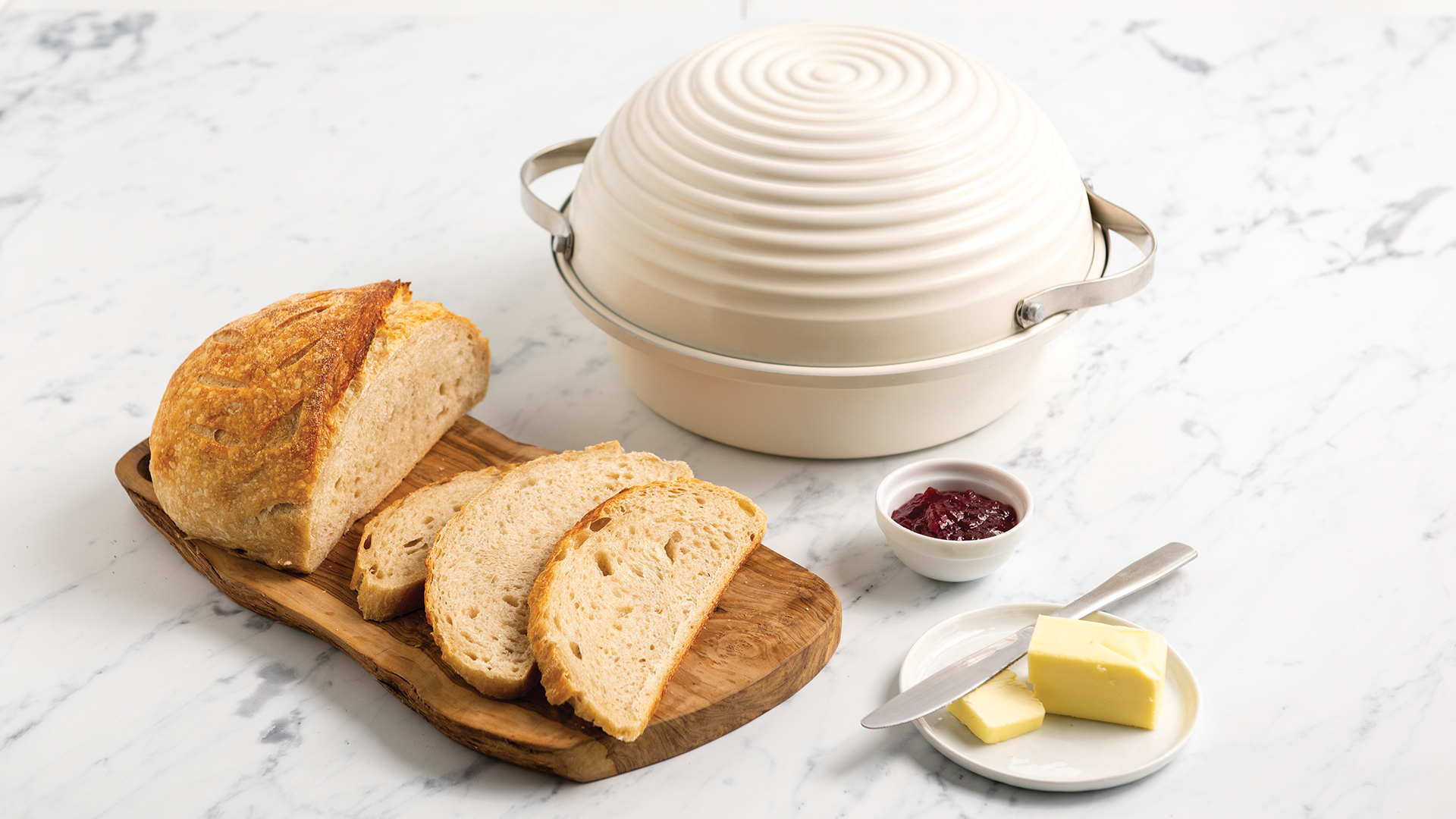 A perfectly baked loaf of sourdough bread sliced and served on a wooden cutting board with butter and jam next to the Simply Sourdough Bread Baking Pan.