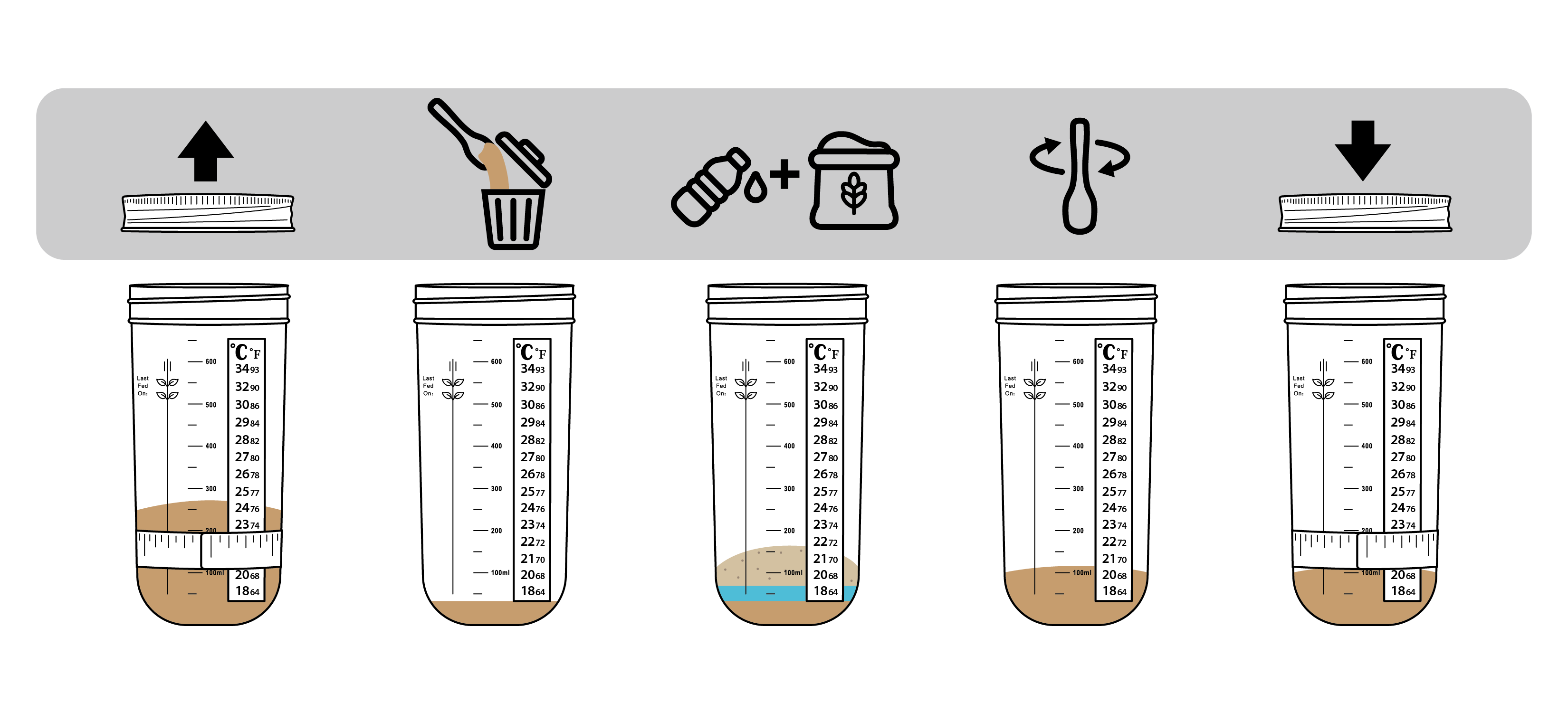Illustration of the steps to feed sourdough starter.