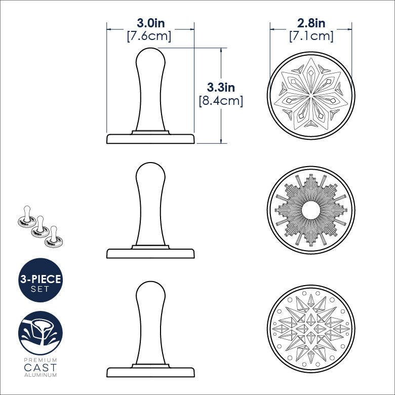 For best results, chill dough and stamps before using. Roll dough balls in sugar or dust stamps with a little flour before scooping and pressing out dough directly onto a baking sheet. This will ensure they don't stick and come cleanly off the stamp. The design presses right into the cookie and helps create a simply gorgeous design that needs no decorating! Proudly designed and made in the USA.
