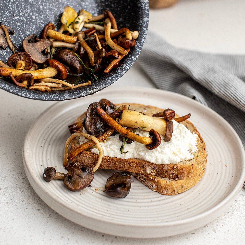 Product image 6 of 10: Nordic Ware Basalt black ceramic nonstick 8-inch skillet with golden sautéed mushrooms