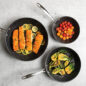 Each pan features a next-generation Swiss-made ceramic nonstick coating, offering healthy, low-oil cooking and effortless food release for easy cleanup. The cast stainless steel riveted handles stay comfortably cool during stovetop use, providing a secure, balanced grip for confident cooking.