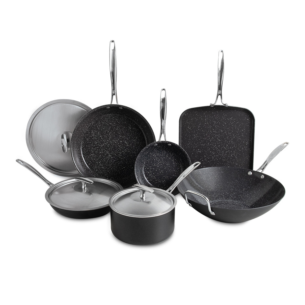 | Material | Skillets & Griddle: Formed Aluminum with stainless steel handle; Wok: Aluminized Steel with stainless steel handle and plated steel helper handle |