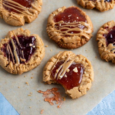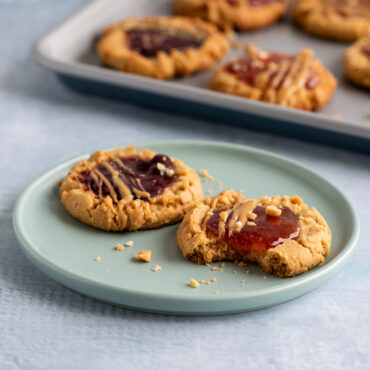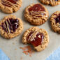 Product image 4 of 10: Freshly baked peanut butter and jelly thumbprint cookies on Nordic Ware nonstick half sheet pan