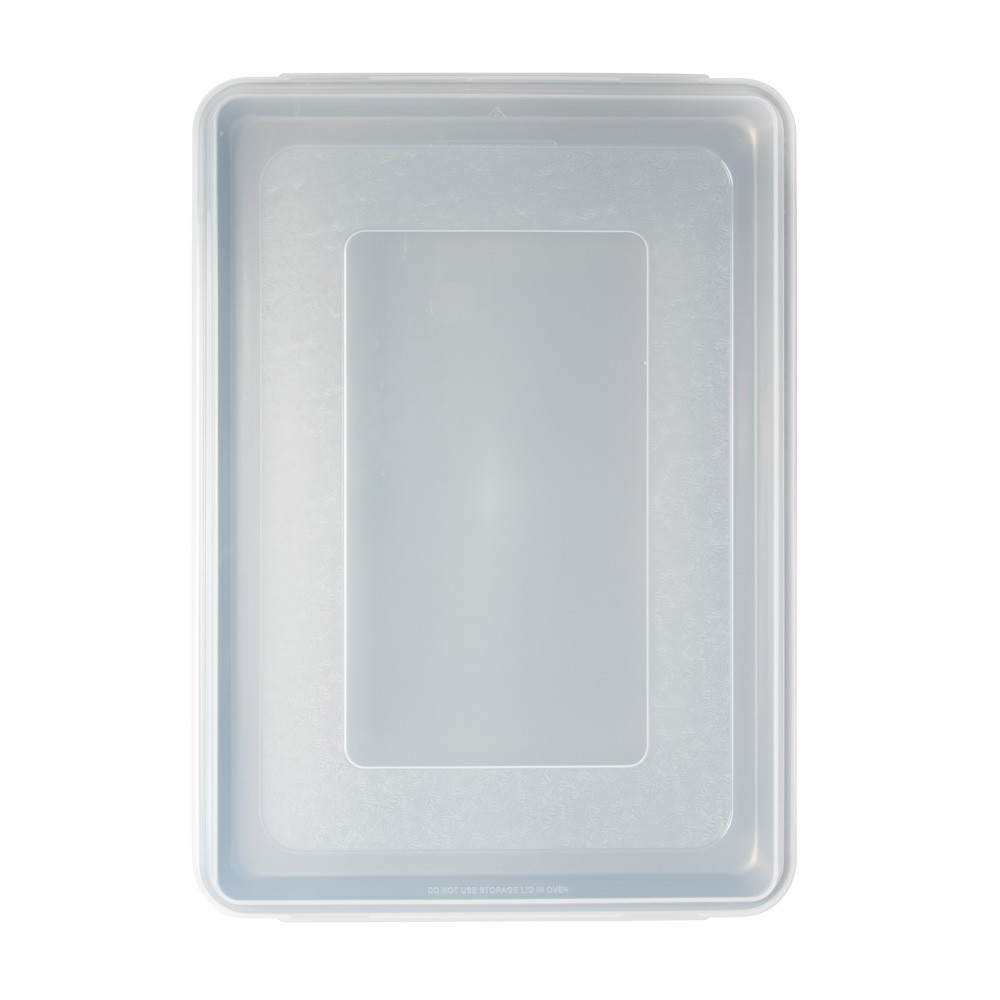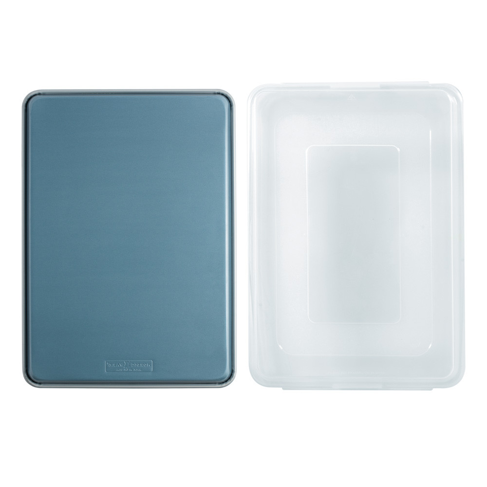 This set includes the Brilliant Big Sheet Pan, a spacious, nonstick-coated aluminum baking sheet with a striking blue metallic exterior and gray interior, ideal for cookies, roasted vegetables, and sheet-pan meals. Also included is the Big Sheet Storage Lid, a sturdy, Melamine-free plastic cover that snaps securely onto the pan for convenient storage and transport of cooled baked goods and prepped ingredients. Please note that the storage lid is intended for use on fully cooled pans only and is not oven safe; top rack dishwasher cleaning is suitable for the lid.