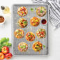 Product image 2 of 6: overhead of various meat and veggie flat breads on cooling rack nested inside brilliant big sheet pan