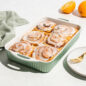 Product image 3 of 7: cardamom rectangular baking pan with glazed cinnamon buns, oranges and plate nearby