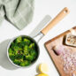 Product image 2 of 9: Nordic Ware 1.5-quart cardamom ceramic nonstick saucepan with steamed broccoli, overhead view with cutting board