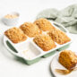 Product image 1 of 7: aluminum mini loaf pan with 8 rectangular cavities, green exterior with white ceramic nonstick finish