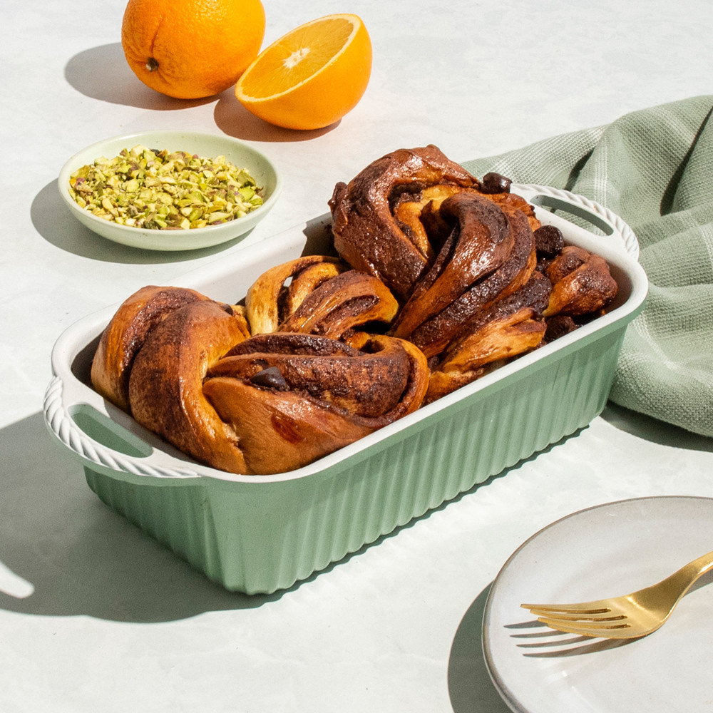 Product image 6 of 8: overhead view of cardamom loaf pan on white background showing green exterior