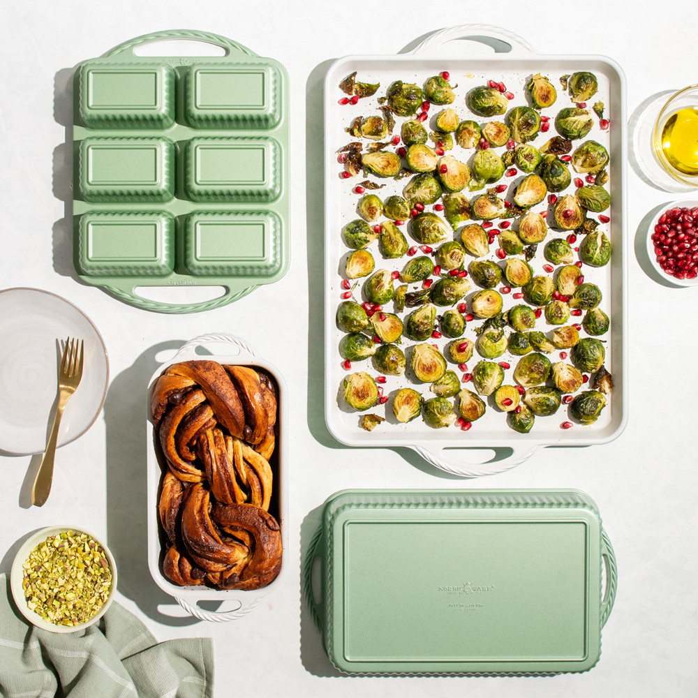 Product image 4 of 8: group image of cardamom bakeware including loaf pan, large baking sheet, rectangular baker, and mini loaf pan