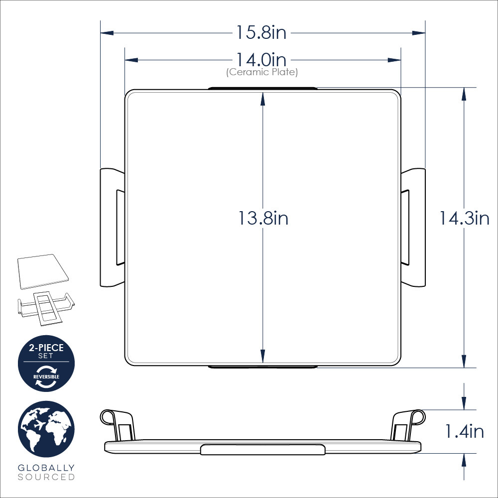 Deluxe Square Pizza Stone with Rack brings brick oven style pizza and crisp artisan breads to your home kitchen with a durable cordierite ceramic pizza stone and a brushed stainless steel rack. The square 14 inch by 14 inch stone with a 1.4 inch profile heats evenly to deliver consistently crisp crusts and golden toppings, and the included over rack lets heat circulate around the pizza so the bottom and edges bake without soggy spots. Use it in the oven or on the grill; the rack may be used with or without the stone when grilling so you can adapt to your equipment and cooking style. Heat safe to 500 F (260 C) and best when preheated at 450 F (232 C) for about 15 minutes, the stone accepts frozen pizzas directly and works beautifully with homemade dough dusted with cornmeal to prevent sticking.