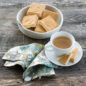 Product image 3 of 6: Golden baked shortbread squares with traditional pattern in wicker basket beside white teacup and saucer