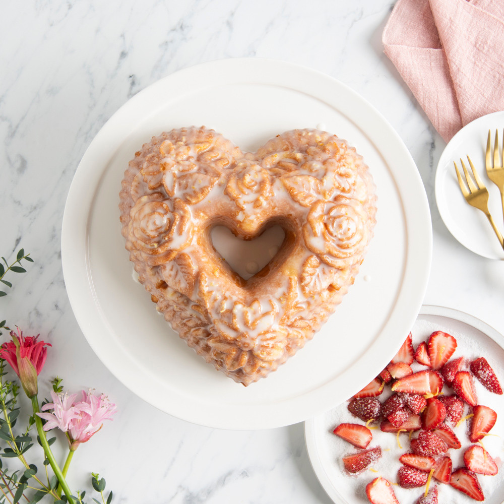 Product image 3 of 8: Overhead of glazed Floral Heart Bundt on white cake stand with a plate of diced strawberries and flowers