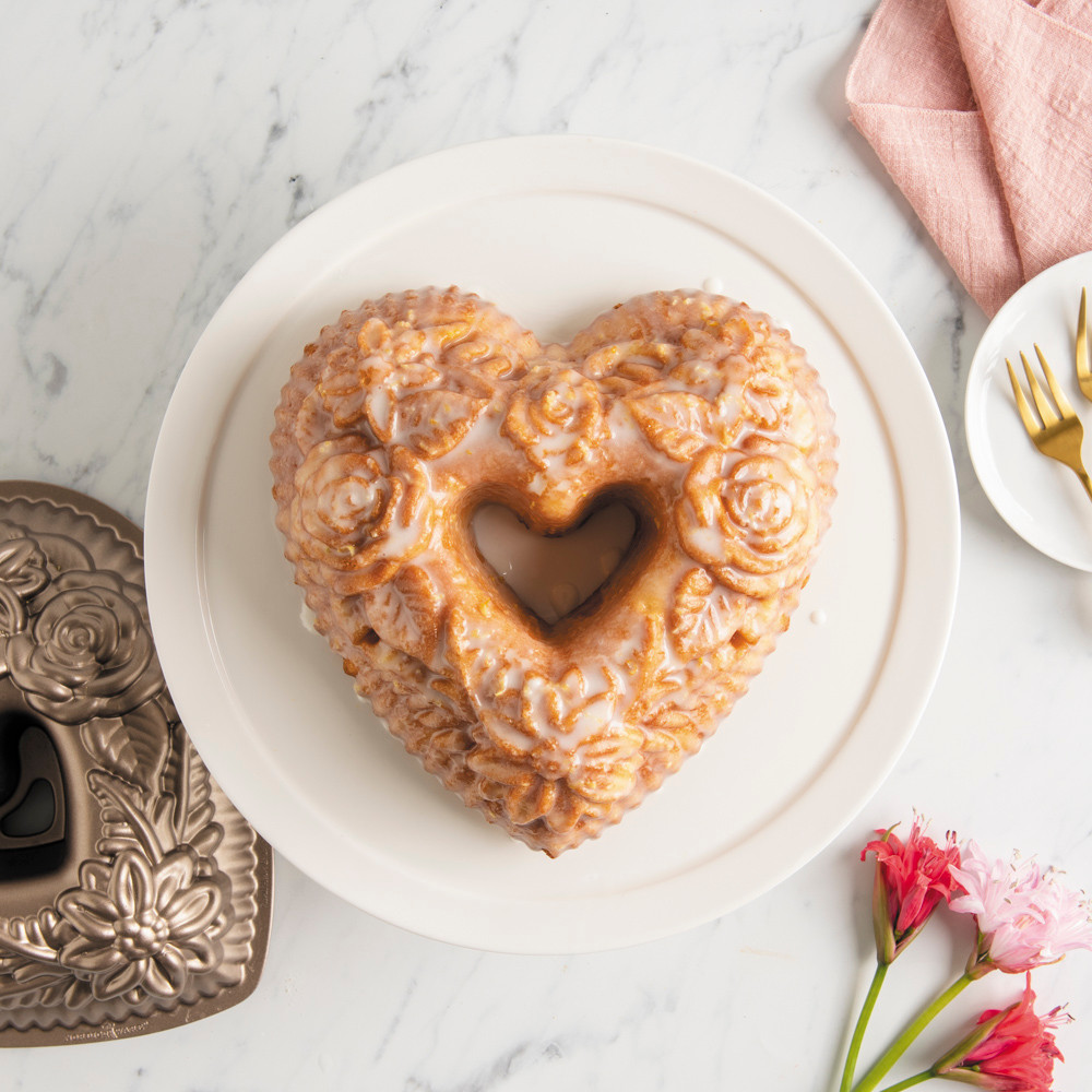 Product image 6 of 8: Nordic Ware cast aluminum floral heart bundt pan with detailed rose and leaf design, 6-cup capacity