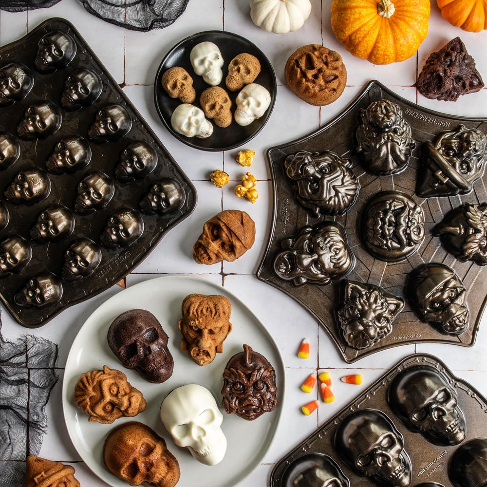 Product image 4 of 8: Group image of Monster Mask Cakelets, Skull Cakelets, and Skull bites with pans on white tile backdrop