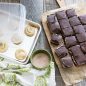 Product image 3 of 4: Three golden rectangular bar cookies with nuts on Nordic Ware aluminum baking pan, natural finish