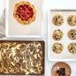 Product image 11 of 13: Three Nordic Ware aluminum half sheet pans displaying baked rustic galette, golden cookies, and chocolate brownie bars