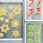 Product image 9 of 13: Assorted holiday cookies including stars, trees, and decorated shapes baked on Nordic Ware aluminum half sheet pans