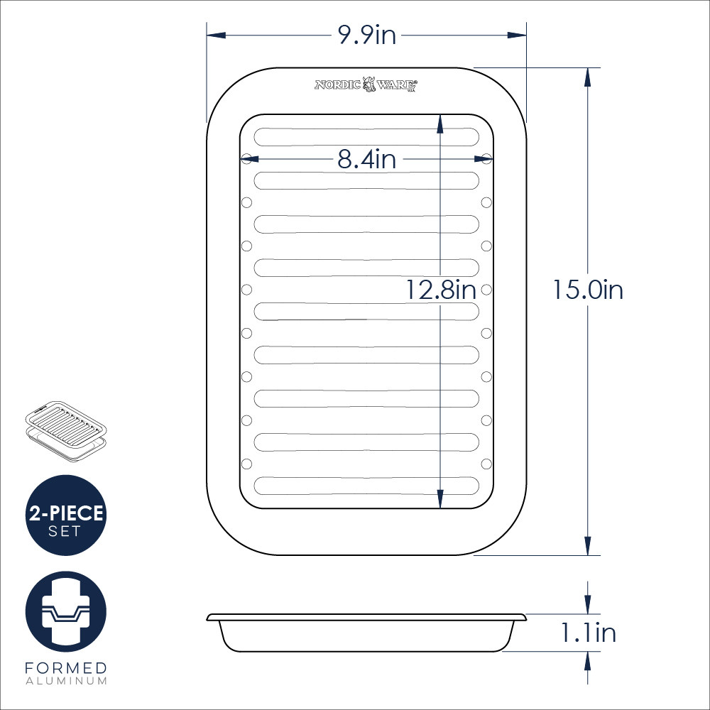 Crafted from high-quality, durable aluminum, both the broiling rack and baking/drip pan withstand high temperatures and frequent use. The set measures 9.9 x 15.0 inches, ideal for home ovens that can accommodate its size. The components are oven safe up to 500°F, and hand wash is recommended to maintain the natural finish and extend product life.