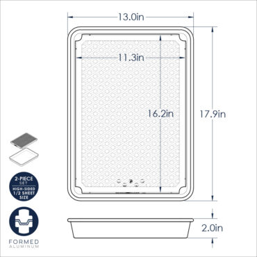 Crafted from pure, uncoated aluminum, the high-sided half sheet pan delivers superior heat conductivity for evenly baked results every time. Both pieces are rust-resistant, warp-resistant, and built for long-lasting performance. The multi-task rack features a single-sheet construction with diagonal reinforcement ribs, angled legs for stability, and trimmed corners for easy handling, allowing fats to drain and airflow to circulate for crisper textures and faster cooling.