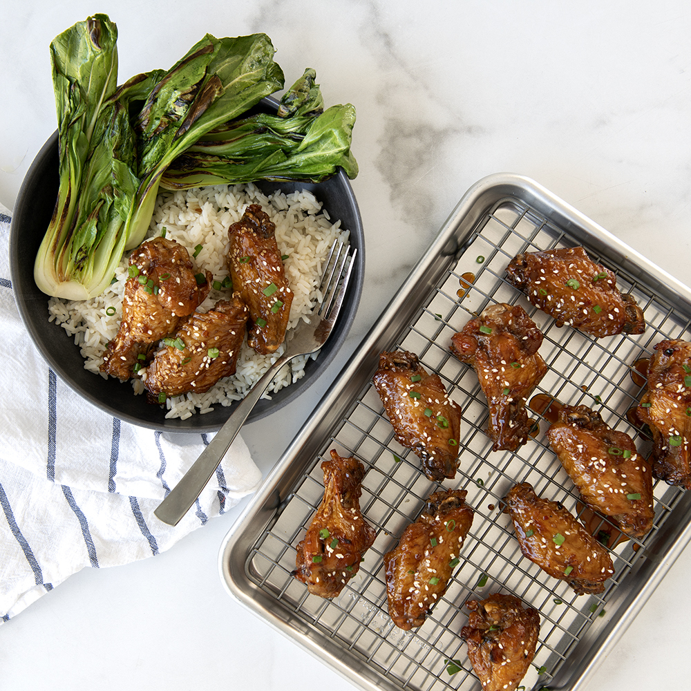 Product image 4 of 10: Nordic Ware aluminum quarter sheet pan with black nonstick cooling grid, displaying golden cooked chicken wings