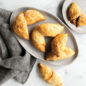 Product image 3 of 3: Golden-brown baked empanadas arranged on white platter with gray kitchen towel, showing flaky crimped edges