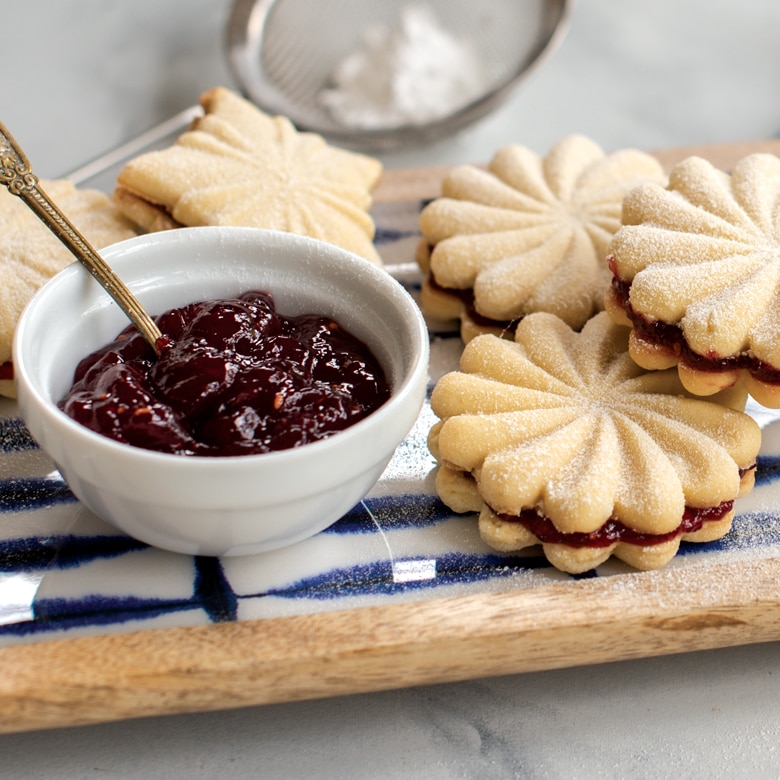 Product image 6 of 10: Sandwich cookies with decorative stamped patterns filled with apricot jam, dusted with powdered sugar on serving plate