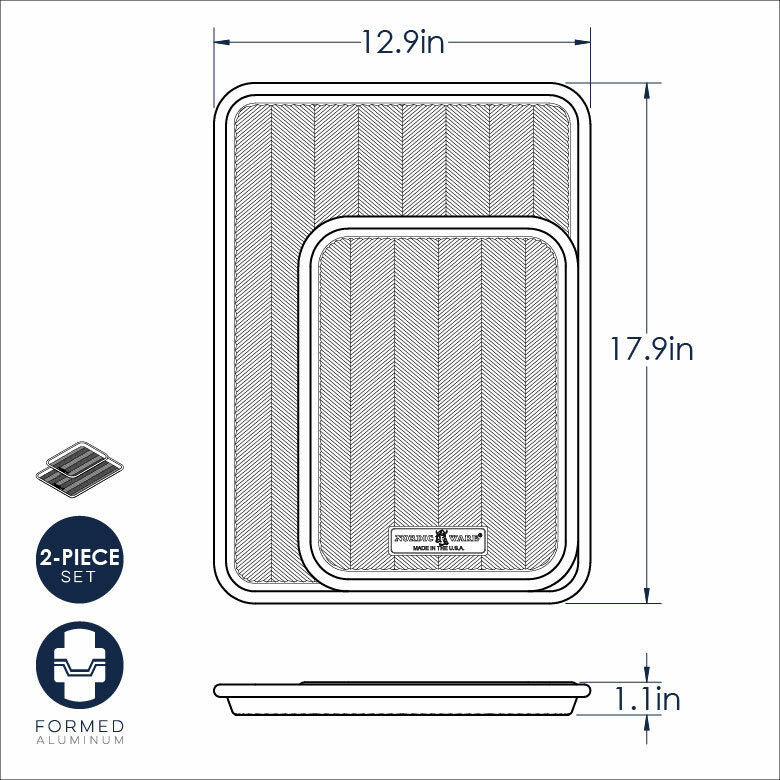 Crafted from pure natural aluminum, both pans provide fast, even heat distribution for perfectly baked cookies, sheet cakes, roasted vegetables, and sheet-pan meals. The exclusive Prism embossed grid strengthens the pans, improves airflow for uniform crisping, and ensures easy food release with effortless cleanup. Encapsulated galvanized steel rims prevent warping, maintaining shape and performance through years of heavy use.