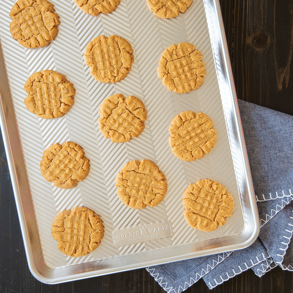 Product image 6 of 10: Golden brown peanut butter cookies arranged on Nordic Ware Prism aluminum half sheet pan with textured surface