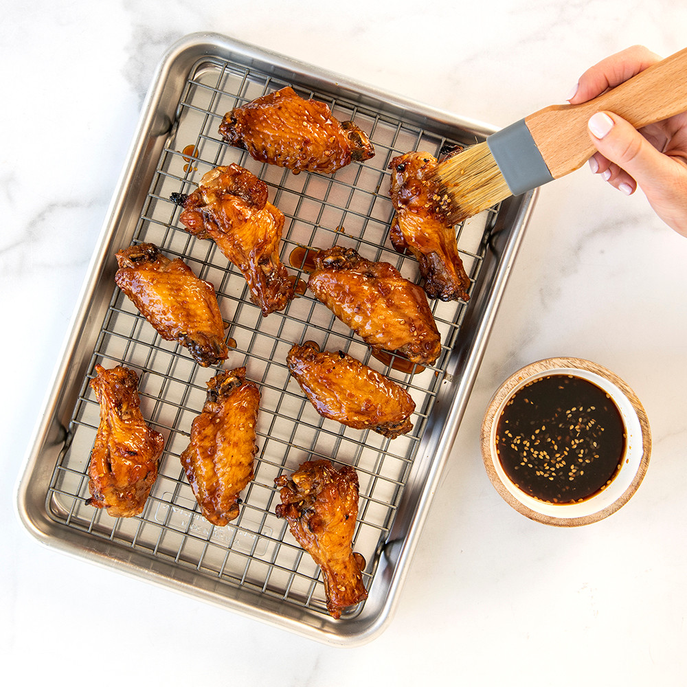 Product image 4 of 5: Raw chicken wings being basted with marinade on Nordic Ware aluminum quarter sheet pan with cooling grid