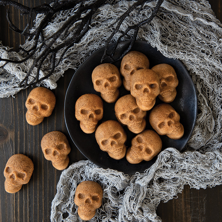 Product image 6 of 10: Small golden-brown skull-shaped cakelets arranged on white plate with Halloween decorations in background