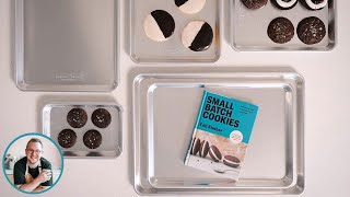 Product image 3 of 4: Small Batch Cookies cookbook beside Nordic Ware aluminum baking sheets with freshly baked golden cookies