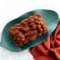 Product image 4 of 9: Overhead image of glazed Sunflower Pumpkin Loaf cake sprinkled with pecan pieces on white plate surrounded pan, pumpkins and crushed pecans