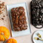Product image 2 of 9: Overhead image of glazed Sunflower Pumpkin Loaf cake on white plate surrounded pan, pumpkins and crushed pecans
