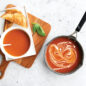 Product image 3 of 12: Nordic Ware Verde 8-inch ceramic nonstick skillet with lid on stovetop, cooking orange tomato soup