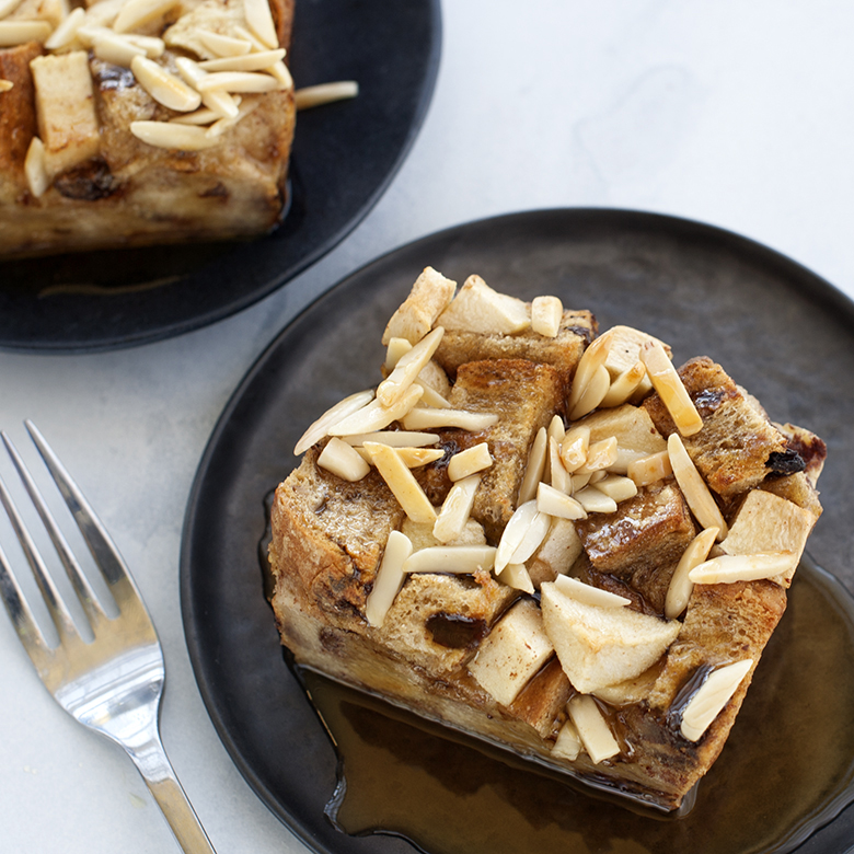 Preheat oven to 350°F and generously butter an 8×8 baking pan with 1 Tbsp butter. Add the cut bread to the pan and scatter the apples throughout. In a bowl, combine eggs, milk, sugar, vanilla, salt and spices and whisk until combined. Pour mixture over the bread and apples. Cover the pan in foil and refrigerate at least 30 minutes, and up to 24 hours. Before baking, use remaining 2 Tbsp butter to dot the top of the mixture, and sprinkle almonds on top. Place foil back onto pan and bake for 20 minutes. Remove the foil and bake another 30-35 minutes or until the custard is set. Serve with warm maple syrup