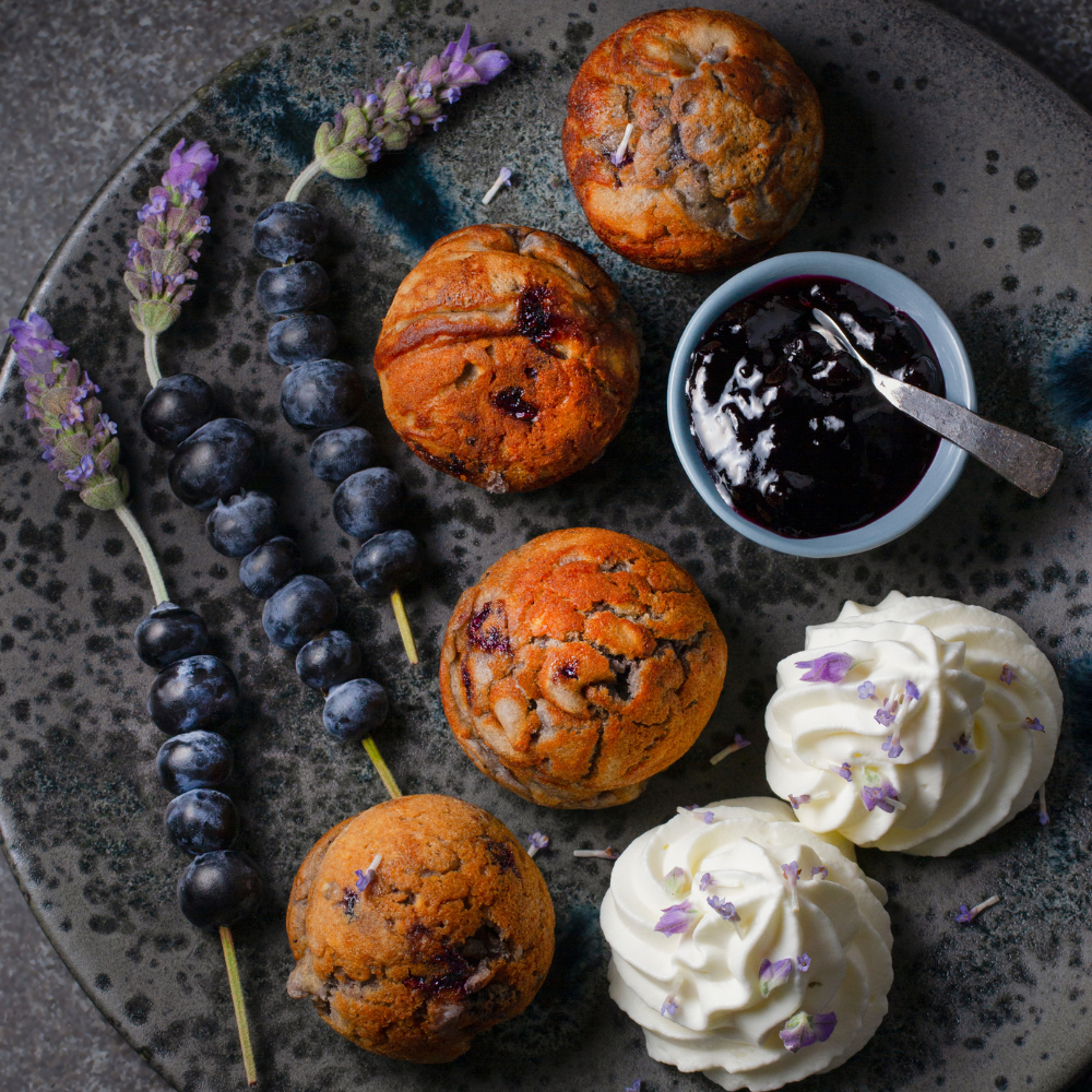 Golden, fluffy Æbleskivers made with a wholesome blend of whole-wheat and all-purpose flour, bursting with fresh blueberries in every bite. Paired with a homemade blueberry jam simmered with orange juice and Cointreau for a bright, fruity touch, and topped with airy whipped cream infused with fragrant lavender and sweet honey. Cooked to perfection in our Danish Ebelskiver Pan, this elegant treat combines rustic flavors with floral sophistication.