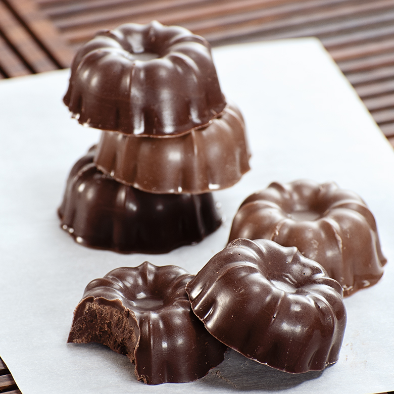 In small heavy saucepan, heat whipping cream over low heat, stirring often until it almost begins to simmer; remove from heat and set aside. In a medium bowl; pour hot cream over bittersweet chocolate and stir until smooth; stir in vanilla. Chill 1-2 hours, until cooled and thickened. Spoon 2 tsp dark chocolate coating in each of the wells in pan. Rotate pan to completely coat inside of each well. Pour out excess coating. Place pan in refrigerator 10 minutes, until chocolate shells are set. Spoon a scant Tbsp of filling into each chocolate-coated well, pressing down lightly with a spoon to level. Spoon additional melted chocolate coating into each well to fill and completely encase the filling. Place in refrigerator 15 minutes, until set. Invert pan and remove candies. Repeat procedure with remaining melted chocolate coating and filling. Makes 24.