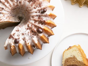 The ultimate coffee Bundt! This Ombre Mocha Bundt Cake uses whipped coffee to create incredible colorful and flavorful layers. Vanilla, Dalgona coffee, and mocha cake layers come together to make the tastiest ombre Bundt with a vanilla glaze and topped with chocolate shavings and chocolate covered espresso beans. Recipe and image by the Feedfeed.
