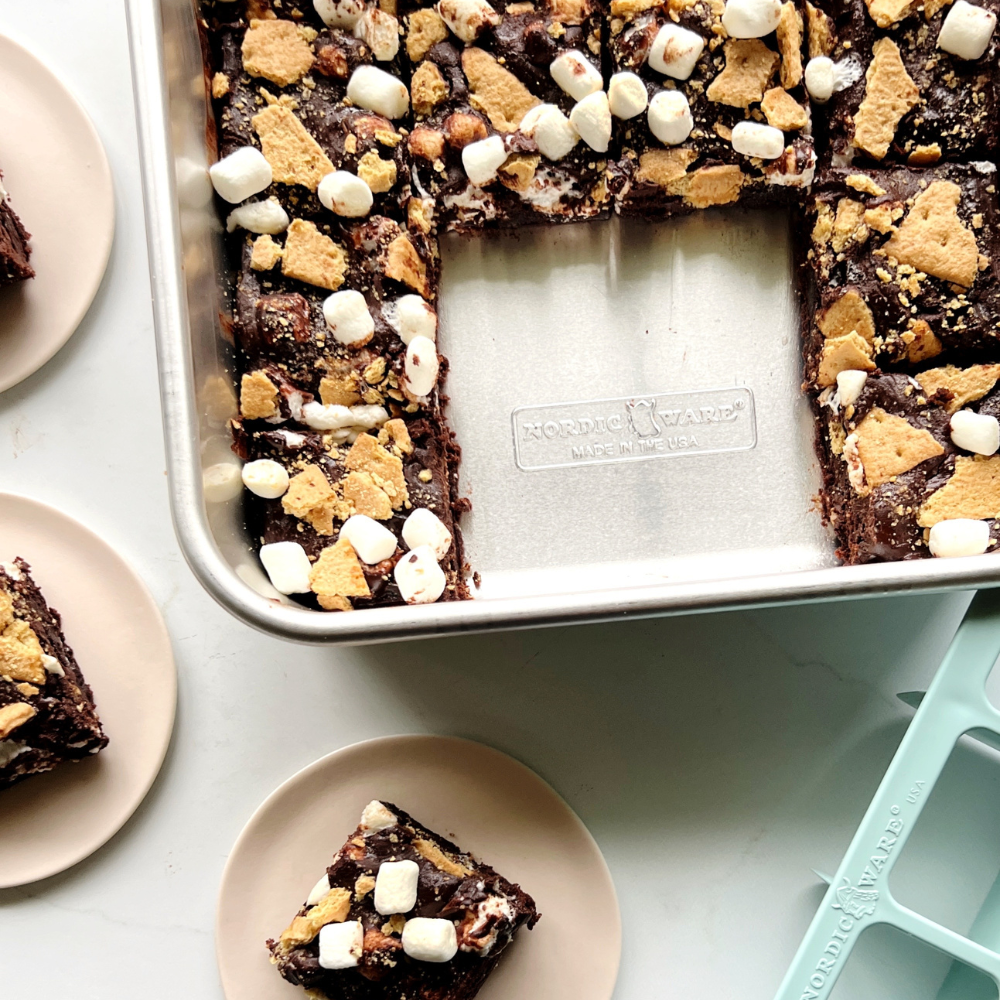 Bring the campfire inside with Sarah Kieffer’s indulgent S’mores Brownies, made with the Brownie Buddy™ Baking Set. These rich, fudgy brownies are layered with gooey marshmallows, a creamy ganache topping, and a graham cracker crunch for the ultimate summer-inspired treat. Baked in a 9×9 inch square pan and cut with the one-of-a-kind plastic cutter, they come out perfectly portioned every time with no scratched pans. Snap on the lid to take these nostalgic treats on the go to BBQs, picnics, and summer gatherings.