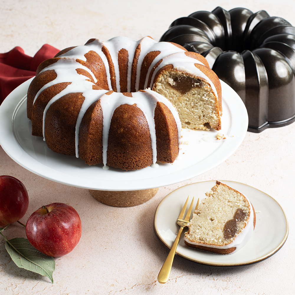 Warm spices, rich vanilla, and a swirl of sweet apple butter come together in this cozy fall Bundt cake. Our Spiced Vanilla Bundt Cake with Apple Butter Filling is the perfect dessert for autumn gatherings, holiday entertaining, or anytime you’re craving a slice of comfort. Baked in our Bronze Cast Bundt pan for an extra touch of fall flair, this cake delivers a stunning presentation with minimal effort, while the apple butter center adds a surprise layer of flavor in every bite. Moist, tender, and full of seasonal spice, it pairs beautifully with coffee or tea for a festive treat. This easy fall Bundt cake recipe requires no elaborate decorating. Simply dust with powdered sugar or drizzle with a light glaze to let the elegant design shine.