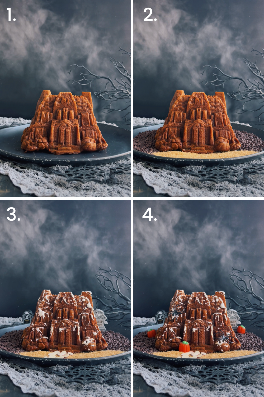There are many other dessert board ideas with our Halloween collection, whether sweet or savory. For all you Bundt-lovers, build a Haunted House Bundt display to really wow your guests at your Halloween party. It’s easy to make and no over-the-top decoration is needed! Start with our Pumpkin Spice Haunted House Bundt recipe and center on a large round platter. Add chocolate chips, sugar in the raw, sliced almonds for stepping stones, marshmallow fluff for “spider webs” and extra Halloween decorations to top it all off. A fun addition are tea lights for a spooky effect when serving. Options are endless!