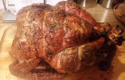 At the halfway mark, flip the turkey so the breast side is now up and take its temperature. Check the temperature in the thigh and breast, not touching bone with your meat thermometer. When done, you want the internal temperature of the turkey to read 160°F in the breast and about 175°F in the thigh. (I usually don’t trust the little pop-up thermometers that come with most turkeys.) When you flip it, you may find that the breast is already quite browned and the temperatures might be reaching their target. Don’t worry, just give it a little more time on the grill breast side up.