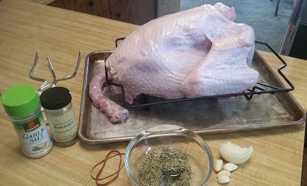 Rinse and pat the turkey dry. Check both the main and the neck cavity for giblets—discard them or freeze them for soup making. We usually grill the neck alongside the turkey. In the empty main cavity of the turkey, scatter the garlic cloves, the onion and the quartered lemon, squeezing the lemon a little. Truss the legs closed to keep stuff from falling out when you flip the turkey. I usually truss the wings too. Spray the rack with cooking spray and place the turkey on the rack, breast side up, on the half sheet. In a small bowl, combine the dried rosemary and garlic salt. Rub half of the mixture over the breast, legs, thighs and wings of the turkey, coating it evenly and pressing it to help it stick. Flip the turkey on its breast so the back is on top. Starting the turkey breast side down helps the juices stay in the breast meat, making for a moister turkey. Rub the remaining half of the mixture over the other side of the turkey.
